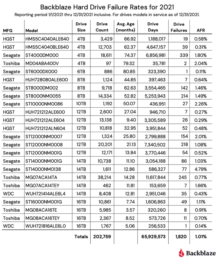 Společnost Backblaze přináší další pravidelné statistiky poruchovosti HDD, tentokráte za celý uplynulý rok 2021. K poslednímu prosinci firma v rámci svých cloudových služeb provozovala celkem 203 168 pevných disků. Report sledující míru selhání a životnost pevných disků zahrnuje 202 759 pevných disků (409 disků není součástí statistiky) značek HGST, Seagate, Toshiba, Western Digital s kapacitami od 4 do 16 TB..