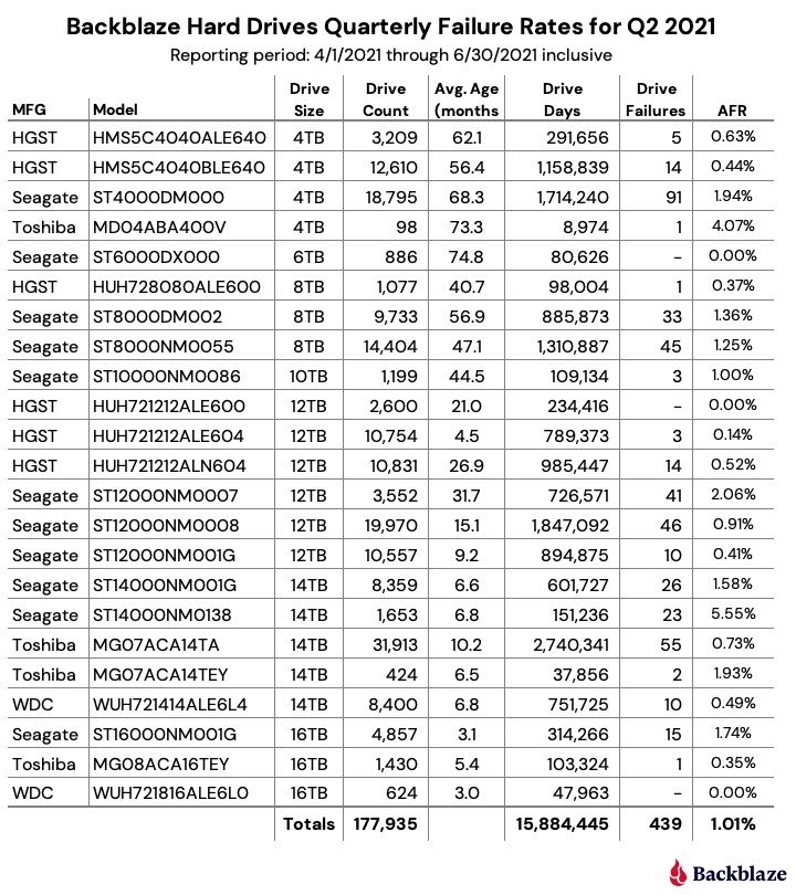 Společnost Backblaze, poskytovatel online zálohovacích služeb, zveřejnila nové statistiky poruchovosti pevných disků za druhé čtvrtletí 2021. V tomto období firma ve svých datacentrech provozovala celkem 178 166 pevných disků, přičemž v přehledu se objevuje 177 935 z nich.
